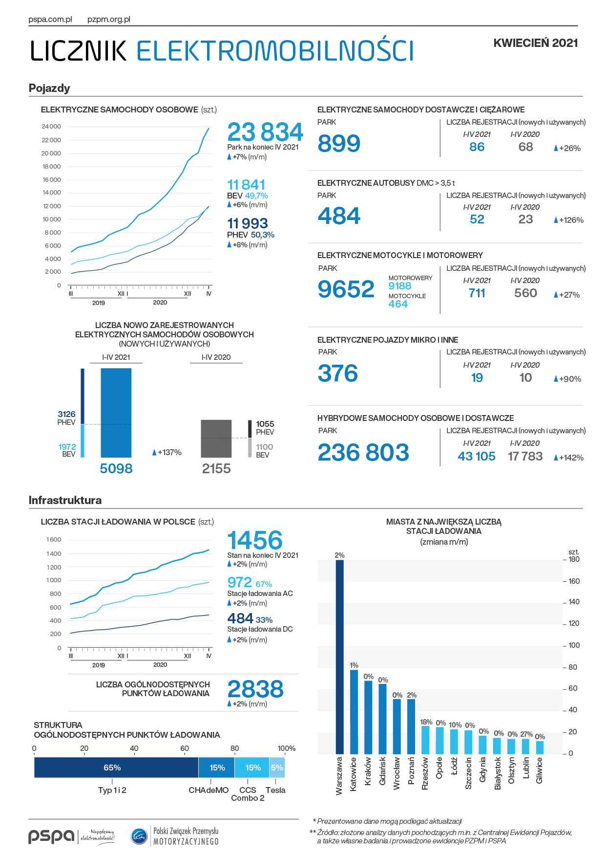 Wraz ze wzrostem liczby pojazdów z napędem elektrycznym, rozwija się również infrastruktura ładowania. Pod koniec kwietnia w Polsce funkcjonowało 1 456 ogólnodostępnych stacji ładowania pojazdów elektrycznych (2 838 punktów). 33% z nich stanowiły szybkie stacje ładowania prądem stałym (DC), a 67% – wolne ładowarki prądu przemiennego (AC) o mocy mniejszej lub równej 22 kW. W kwietniu uruchomiono 31 nowych, ogólnodostępnych stacji ładowania (58 punktów).