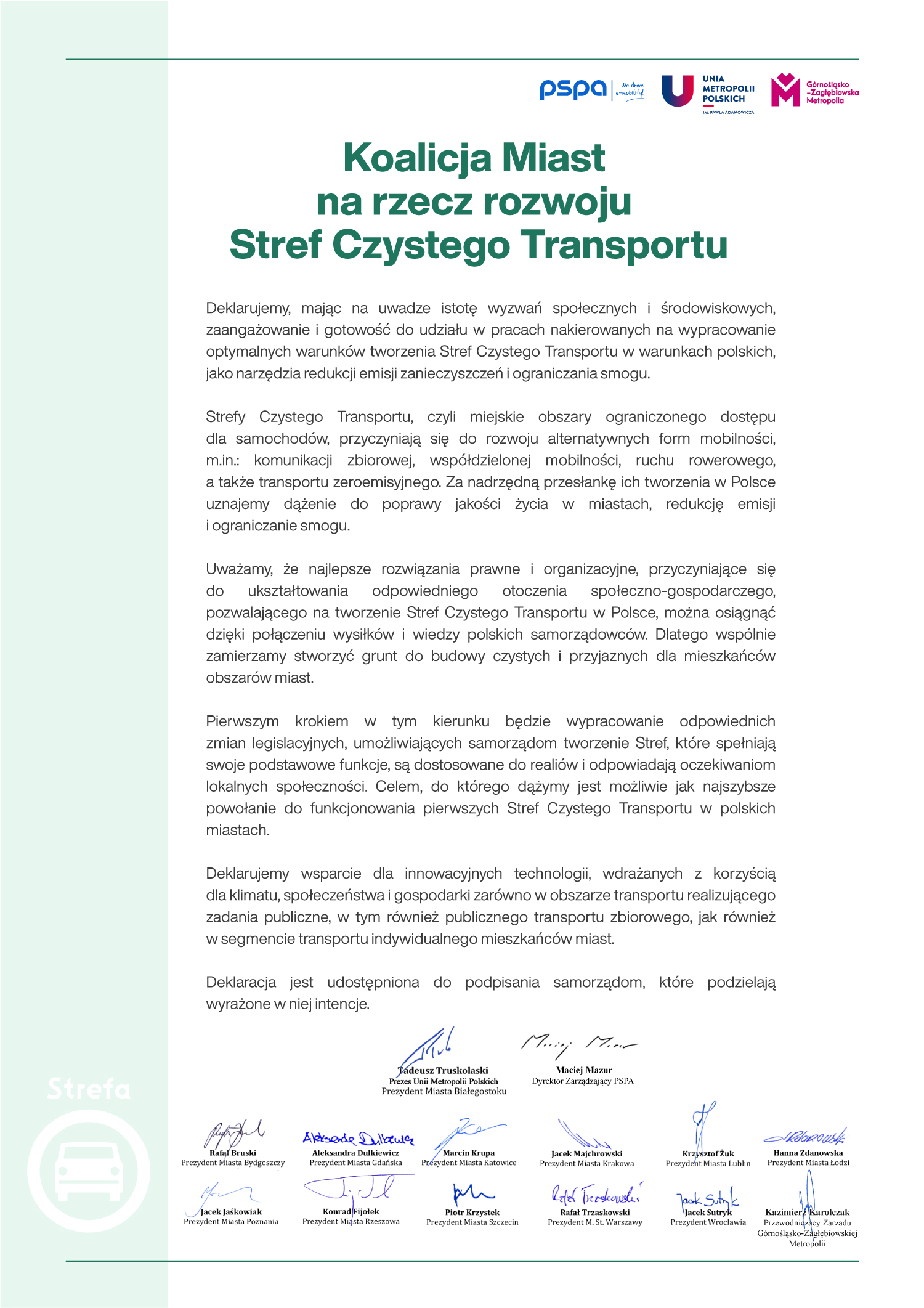 – Pierwszym krokiem w tym kierunku będzie wypracowanie odpowiednich zmian legislacyjnych, umożliwiających samorządom tworzenie Stref, które spełniają swoje podstawowe funkcje, są dostosowane do realiów i odpowiadają oczekiwaniom lokalnych społeczności. Celem, do którego dążymy jest możliwie jak najszybsze powołanie do funkcjonowania pierwszych Stref Czystego Transportu w polskich miastach – czytamy w deklaracji.