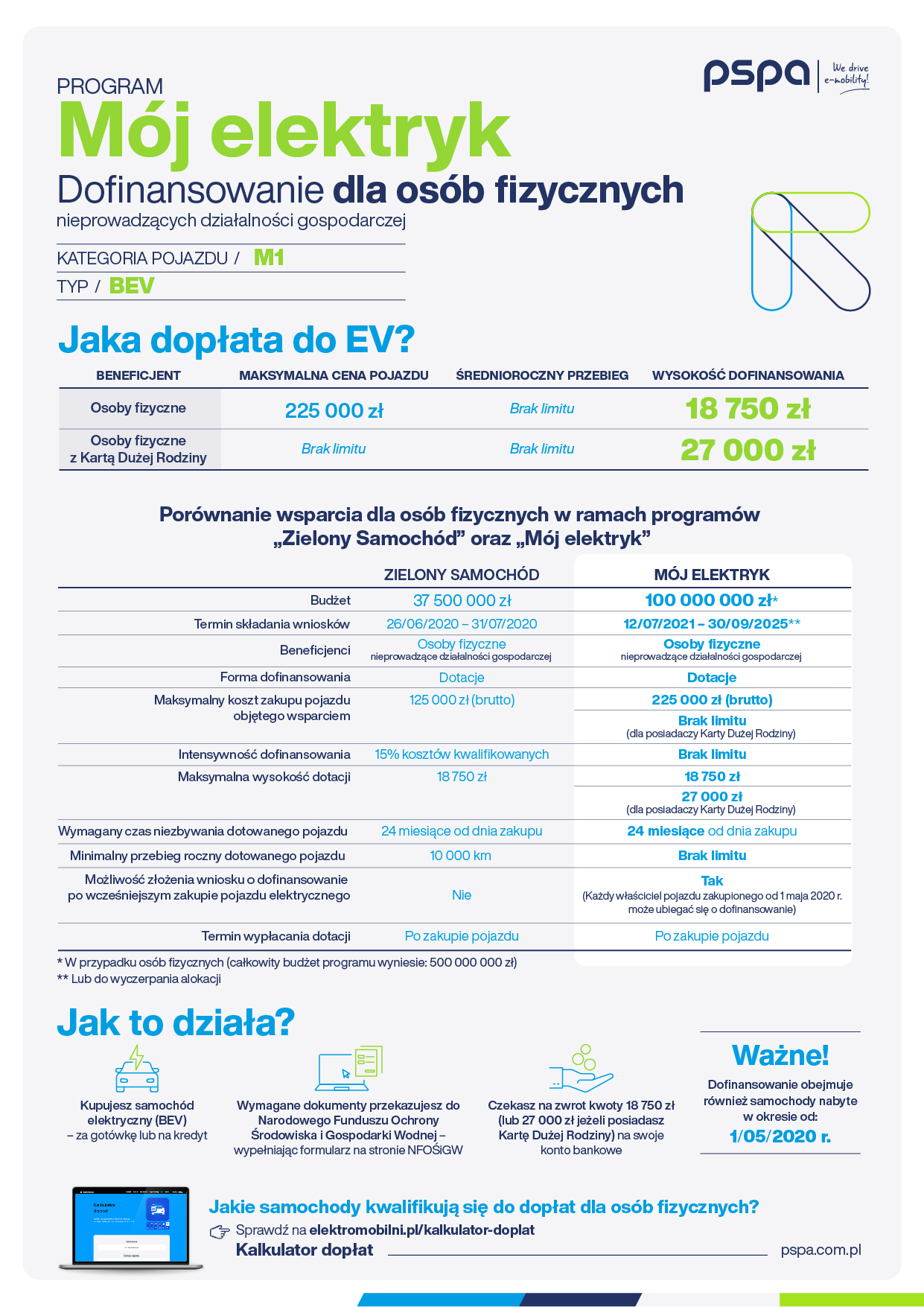 W celu ułatwienia wyboru odpowiedniego modelu samochodu, w ramach kampanii społecznej elektromobilni.pl, PSPA uruchomiło Kalkulator dopłat NFOŚiGW dla osób fizycznych. Dzięki niemu, każdy zainteresowany zakupem EV może w łatwy sposób obliczyć, ile zapłaci za pojazd po uwzględnieniu dotacji. Kalkulator jest dostępny na stronie https://elektromobilni.pl/kalkulator-doplat.