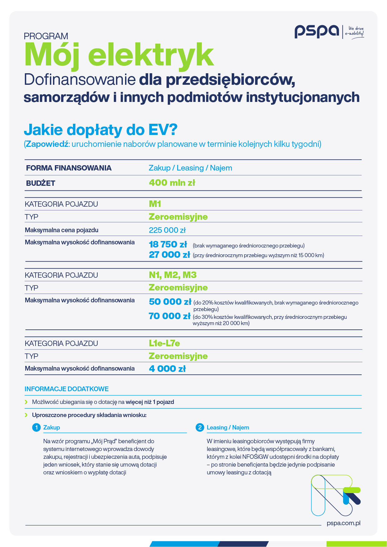 Rozszerzenie grona beneficjentów mogących ubiegać się o dofinansowanie zakupu samochodu elektrycznego o przedsiębiorców i samorządy, podniesienie wysokości dopłaty do 27 tys. zł dla samochodów osobowych i utrzymanie dofinansowania w kwocie 70 tys. dla modeli dostawczych. Ponadto, zwiększenie limitu maksymalnej ceny dotowanego pojazdu elektrycznego do 225 tys. zł, znaczne uproszczenie procedur oraz uwzględnienie leasingu, jako dopuszczalnej formy finansowania – to, zdaniem Polskiego Stowarzyszenia Paliw Alternatywnych (PSPA), najistotniejsze punkty nowego programu wsparcia nabywców samochodów elektrycznych „Mój elektryk” NFOŚiGW. Program stanowi odpowiedź na znaczną część postulatów wysuwanych przez branżę. Po wejściu w życie wszystkich zapowiedzi Narodowego Funduszu, „Mój elektryk” będzie miał potencjał by istotnie wpłynąć na tempo rozwoju elektromobilności w Polsce.