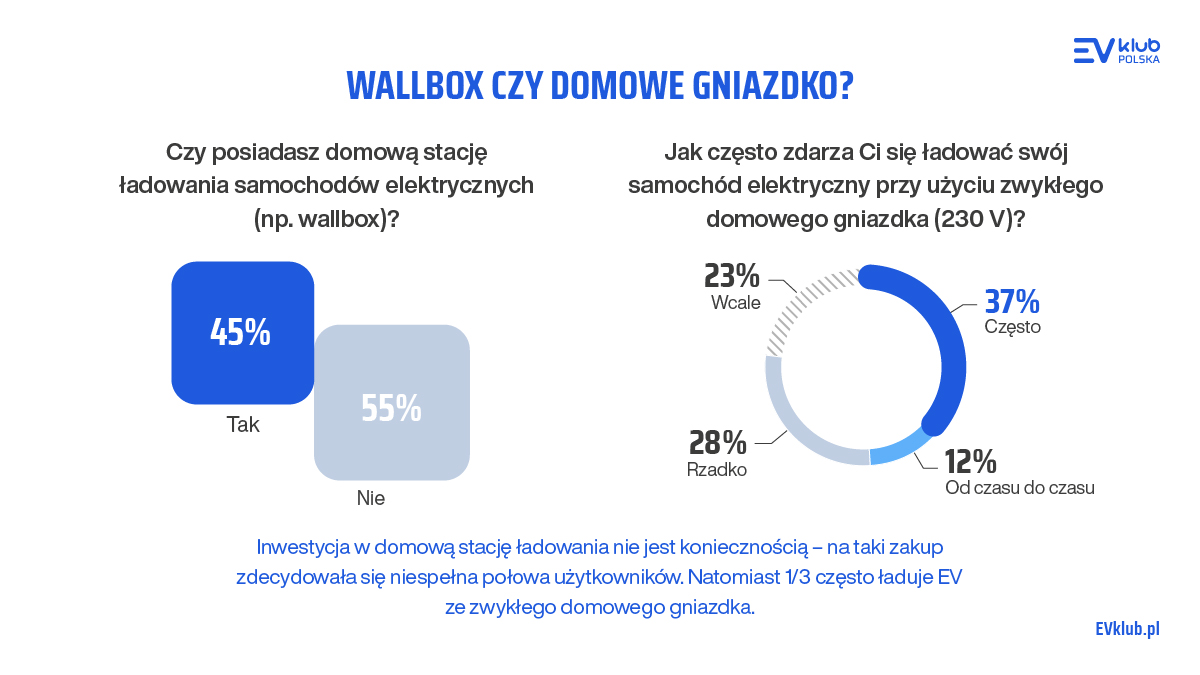 Z badania wynika także, że dzięki coraz większym zasięgom oraz coraz wyższym mocom ładowania, samochody elektryczne stają się coraz bardziej praktyczne w codziennym użytkowaniu. Niemal co trzeci ankietowany (31 proc.) używa pojazdu elektrycznego jako jedynego w gospodarstwie domowym. 32% użytkowników regularnie korzysta ze stacji ogólnodostępnych, a 83% kierowców EV w Polsce preferuje ładowanie swoich pojazdów w domu. 50% ankietowanych uzupełnia energię w akumulatorze samochodu w nocy, 27% podczas dnia. 45% posiada wallboxa, czyli naścienną ładowarkę, a 32% zamierza nabyć takie urządzenie w przyszłości.