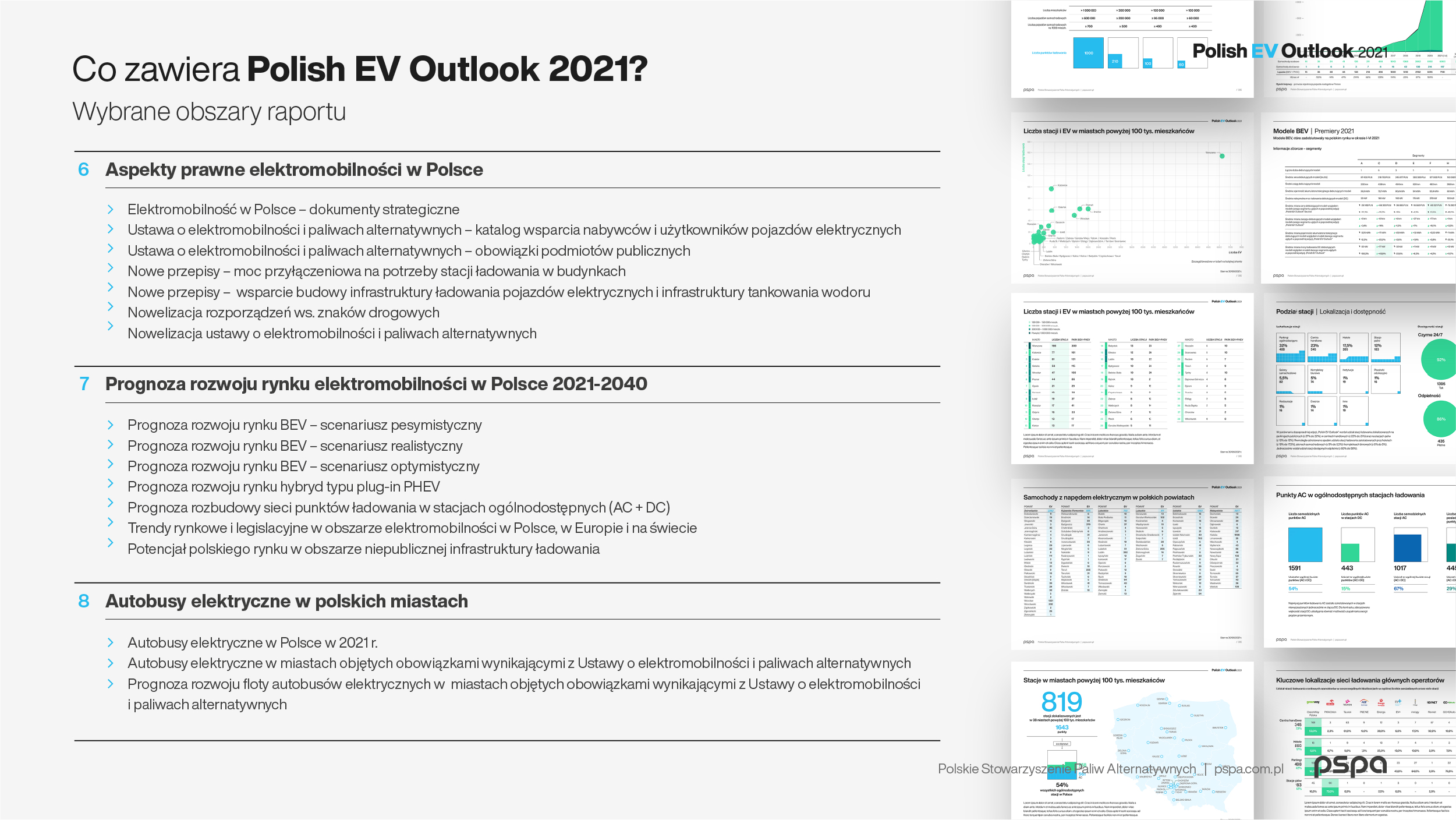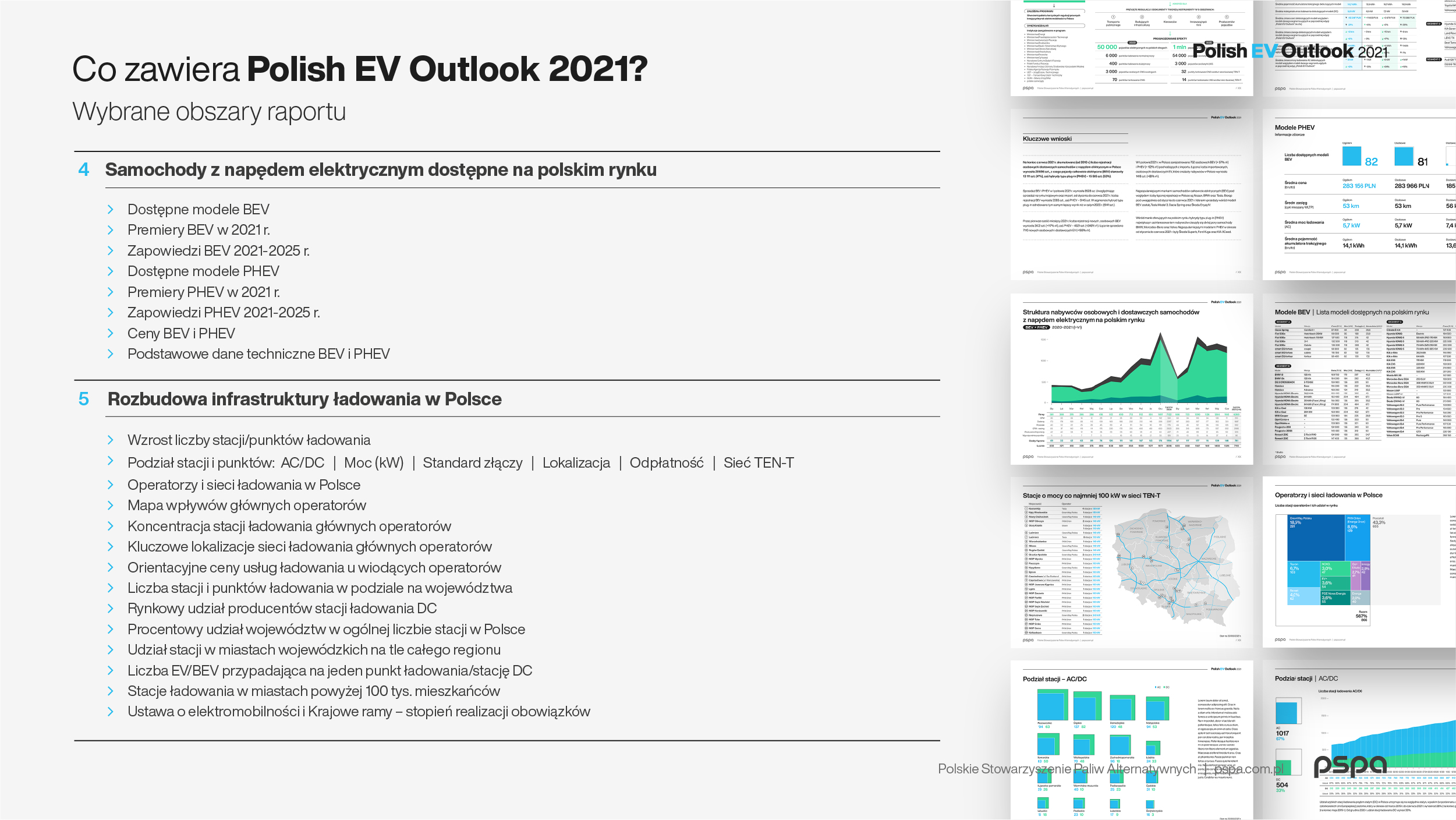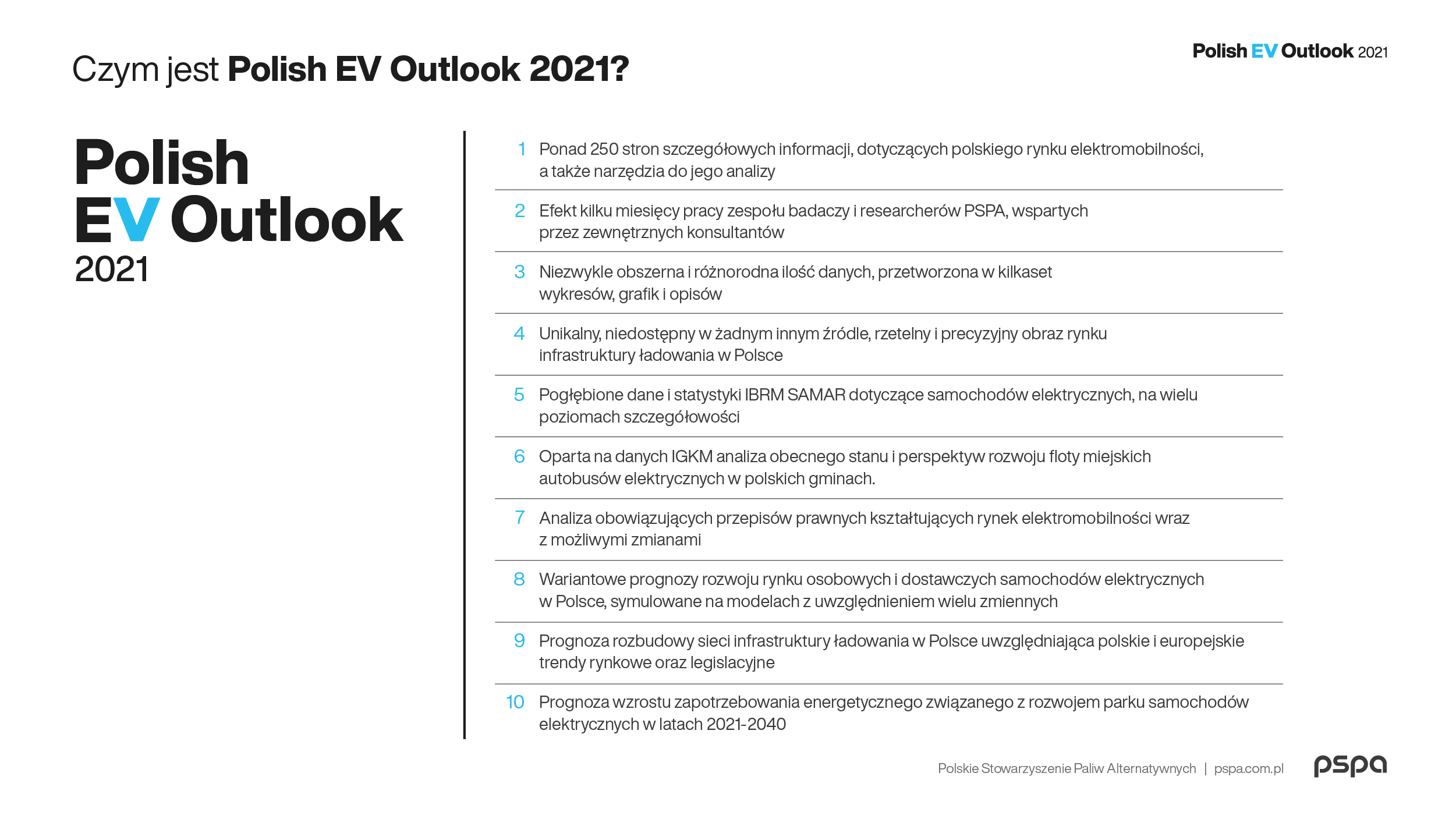Polish EV Outlook 2021 to nie tylko ponad 250 stron szczegółowych informacji, dotyczących polskiego rynku elektromobilności i obejmujących niezwykle obszerną i różnorodną ilość danych, przetworzoną w kilkaset wykresów, grafik i opisów, ale także narzędzia do jego analizy. Raport stanowi efekt kilku miesięcy pracy Centrum Badań i Analiz PSPA, wspieranego przez zewnętrznych konsultantów.