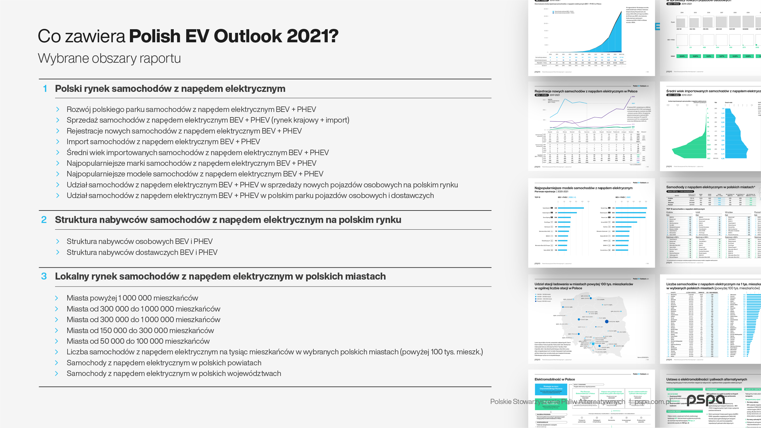 To opracowana przez PSPA, wiodąca publikacja polskiego rynku elektromobilności, kluczowa dla planowania i prognozowania biznesowego. Agregowane przez wiele miesięcy dane pozwalają na wielowymiarową analizę sektora na poziomie lokalnym i ogólnokrajowym.