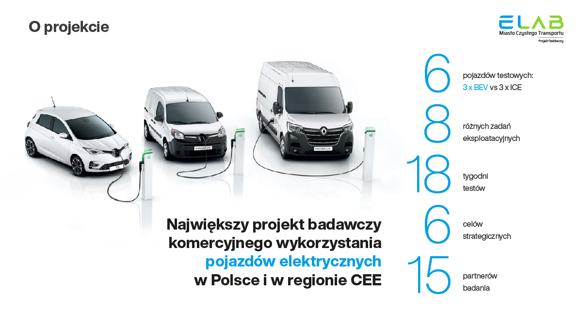 – Renault, dostawca samochodów do projektu ELAB, oferuje już od wielu lat pełną gamę modeli elektrycznych. Przebieg badania udowodnił, że są one w stanie w pełni wykonywać wszechstronne zadania transportowe. Renault Zoe, łączące w sobie bezemisyjny napęd, bardzo duży zasięg – do 395 km (WLTP), szybkość ładowania – zwłaszcza prądem przemiennym o mocy do 22 kW, czy prądem stałym o mocy 50 kW, jest optymalnym pojazdem osobowym do poruszania się nie tylko w obszarach miejskich, ale też umożliwia bezproblemową podróż międzymiastową. Renault Kangoo i Master electric dzięki swoim parametrom użytkowym: ładowność, pojemność bagażowa, w połączeniu z elektrycznym napędem udowodniły, że w obszarach miejskich możemy już w pełni korzystać z dostaw realizowanych bezemisyjnym transportem – mówi Andrzej Gemra Ekspert ds. Public Affaires & Promocji Elektromobilności, Renault Polska.