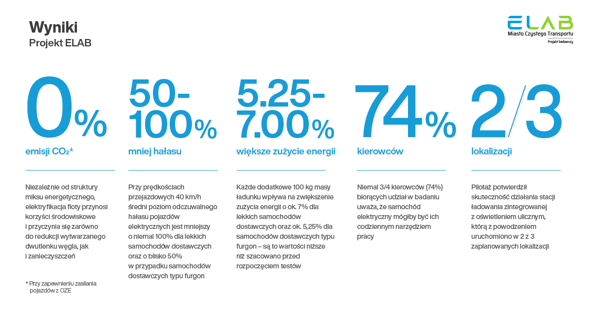 W trakcie badania przeprowadzono pogłębioną analizę porównawczą oddziaływania pojazdów elektrycznych i spalinowych na środowisko w realnych warunkach eksploatacyjnych. Wyniki badania potwierdziły pozytywne skutki ekologiczne wiążące się z elektryfikacją parku samochodowego. Badanie przeprowadzone w ramach projektu, wykazało, że pojazdy elektryczne zasilane energią ze źródeł odnawialnych mogą być w 100% zeroemisyjne w zakresie CO2. Dzięki zapewnieniu zielonej energii przez firmę Veolia, samochody elektryczne na etapie eksploatacji umożliwiły redukcję całej emisji dwutlenku węgla, która w przypadku pojazdów spalinowych wynosi 25,9 kg/100 km (segment samochodów dostawczych), 16,6 kg/100 km (segment lekkich samochodów dostawczych) oraz 13,1 kg/100 km (segment samochodów osobowych). W ramach projektu ELAB przeprowadzono również analizę porównawczą emisji hałasu dostawczych pojazdów elektrycznych i spalinowych. Badanie wykazało, że samochody elektryczne ograniczają emisje hałasu w największym stopniu przy niższych prędkościach przejazdowych. Przy prędkości 40 km/h średnia wartość poziomu ekspozycyjnego związana z poruszaniem się EV w przypadku lekkich pojazdów dostawczych była niższa niemal dwukrotnie.