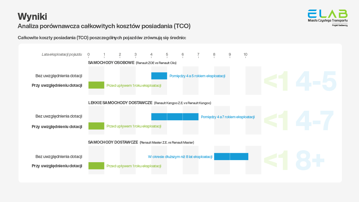 Kluczowym elementem projektu ELAB była analiza porównawcza całkowitych kosztów posiadania (TCO) pojazdów elektrycznych i spalinowych w rzeczywistych warunkach użytkowania. Badanie wykazało, że nabycie elektrycznych samochodów osobowych oraz lekkich pojazdów dostawczych może być bardziej opłacalne niż ich konwencjonalnych odpowiedników, nawet przy założeniu braku obowiązywania programów finansowego wsparcia elektromobilności. Wyższe ceny EV są rekompensowane przez znacznie niższe koszty obciążające ich posiadaczy na etapie eksploatacji.