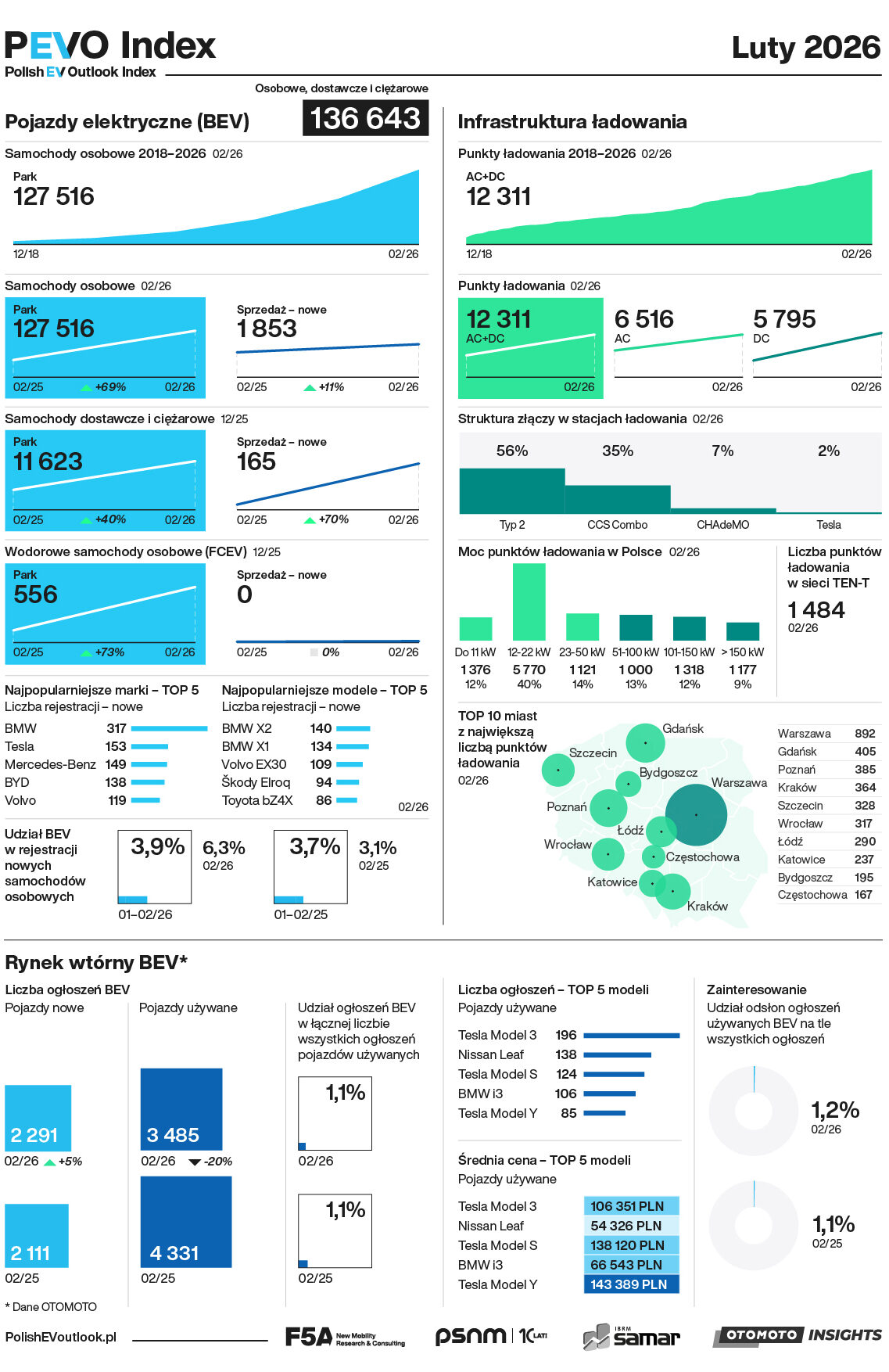 „PEVO Index” obejmuje również dane na temat oferty na rynku wtórnym elektromobilności w Polsce. Pod koniec lutego 2026 r. liczba ogłoszeń używanych BEV na portalu OTOMOTO wynosiła 3 485. To spadek o 20% r/r. Udział ogłoszeń samochodów całkowicie elektrycznych w łącznej liczbie ogłoszeń pojazdów używanych wyniósł 1,1%. Takie oferty odpowiadały w lutym za 1,2% wszystkich odsłon ogłoszeń na portalu OTOMOTO. Najpopularniejszymi pod względem podaży modelami BEV na wtórnym rynku e-mobility w Polsce były Tesla Model 3 (196 ogłoszeń w lutym 2026 r. ze średnią ceną 106 351 PLN), Nissan Leaf (138 ogłoszeń ze średnią ceną 54 326 PLN) oraz Tesla Model S (124 ogłoszenia ze średnią ceną 138 120 PLN).
