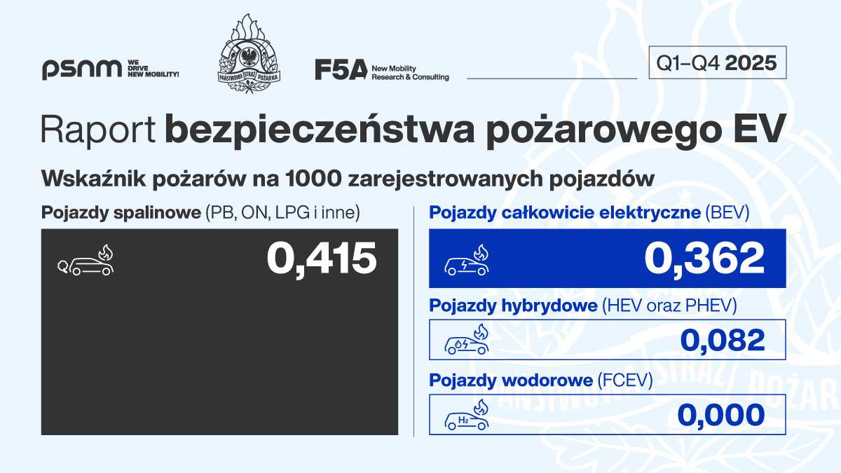 Z danych Państwowej Straży Pożarnej, przeanalizowanych przez F5A New Mobility Research & Consulting w ramach „Raportu Bezpieczeństwa Pożarowego EV”, wynika, że w 2025 r. w Polsce doszło do 44 pożarów pojazdów całkowicie elektrycznych, 105 pożarów pojazdów hybrydowych oraz 1 pożaru pojazdu wodorowego. W tym samym czasie odnotowano 9 515 pożarów pojazdów spalinowych. W ujęciu skumulowanym od 2020 r. do końca 2025 r. liczba pożarów BEV wyniosła 108, wobec 55 712 pożarów pojazdów spalinowych.